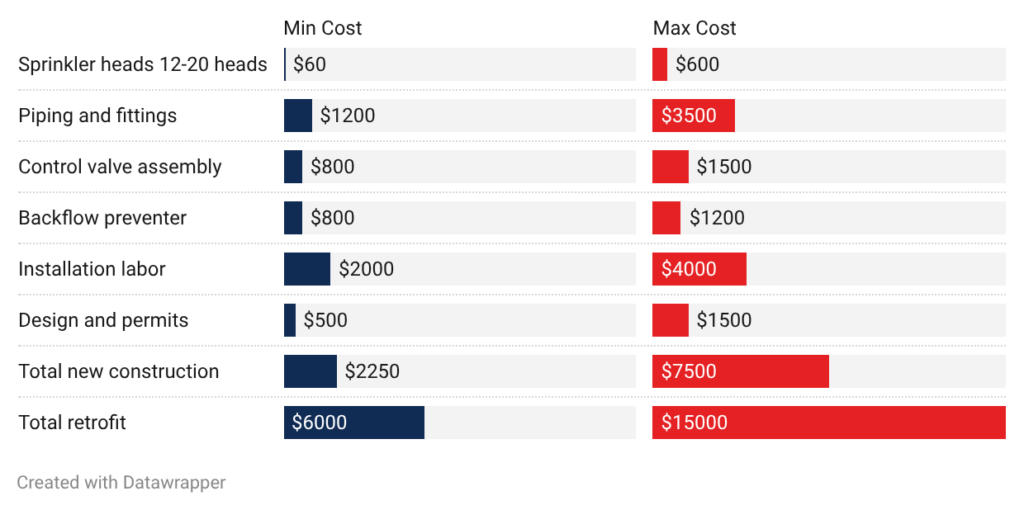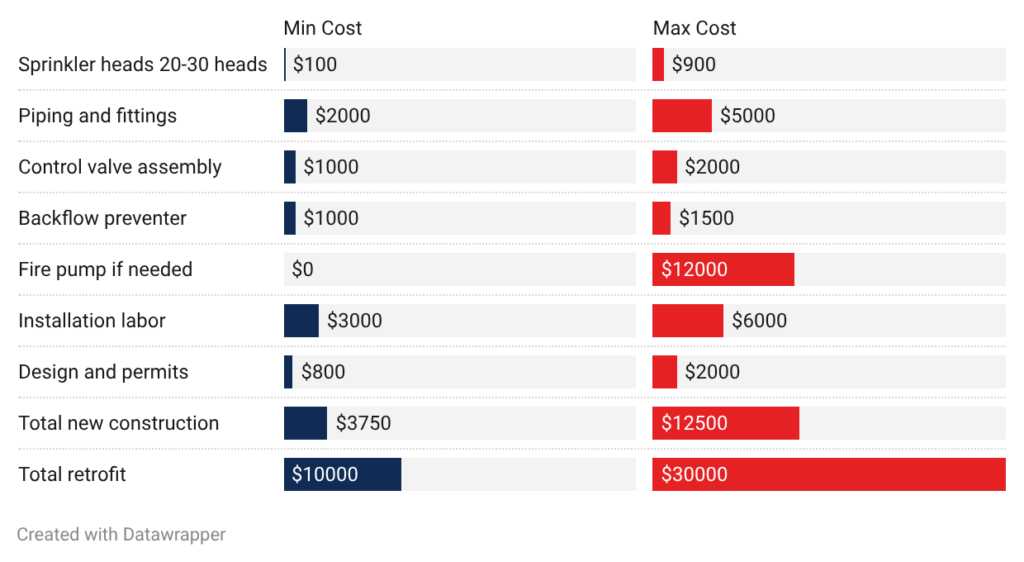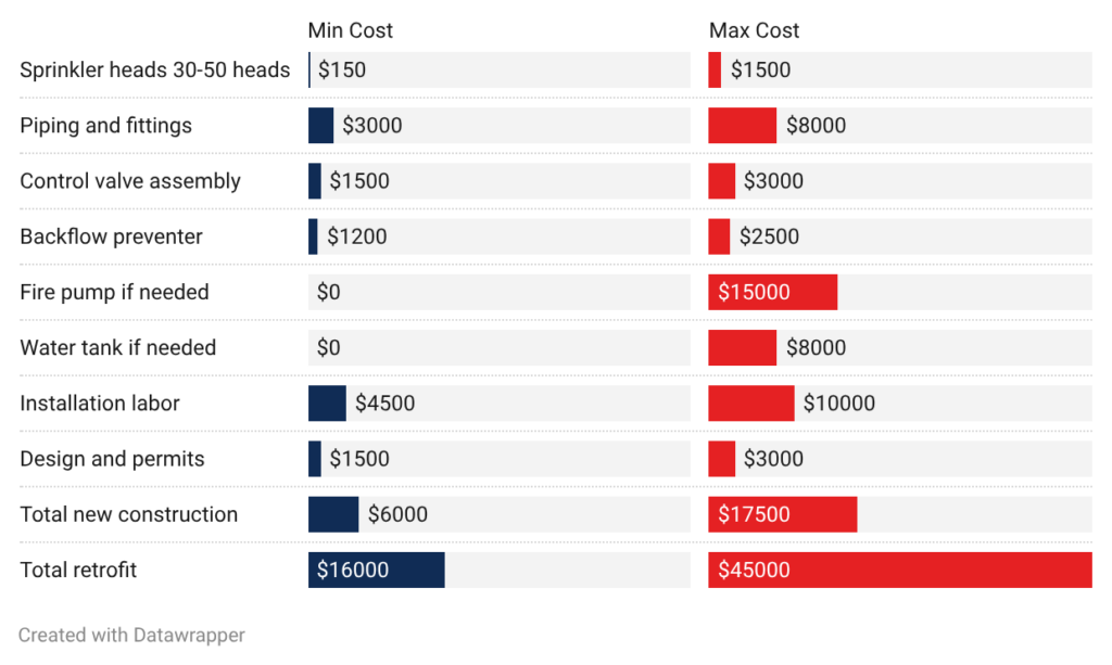 - Fire pump: Pumps add $0 to $12,000 when needed. Homes with adequate municipal pressure don’t need pumps. Properties on wells or with weak water service need pumps at the high end.