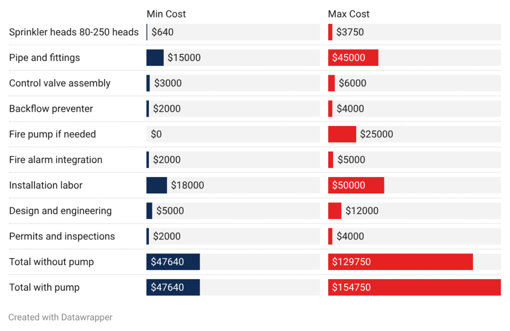- 20,000 sq ft commercial: Larger installations cost $60,000 to $140,000. Multi-story office buildings need vertical risers and separate zones on each floor adding $15,000 to $25,000 compared to single-story buildings. Fire pumps add another $15,000 to $25,000 when municipal pressure is inadequate.