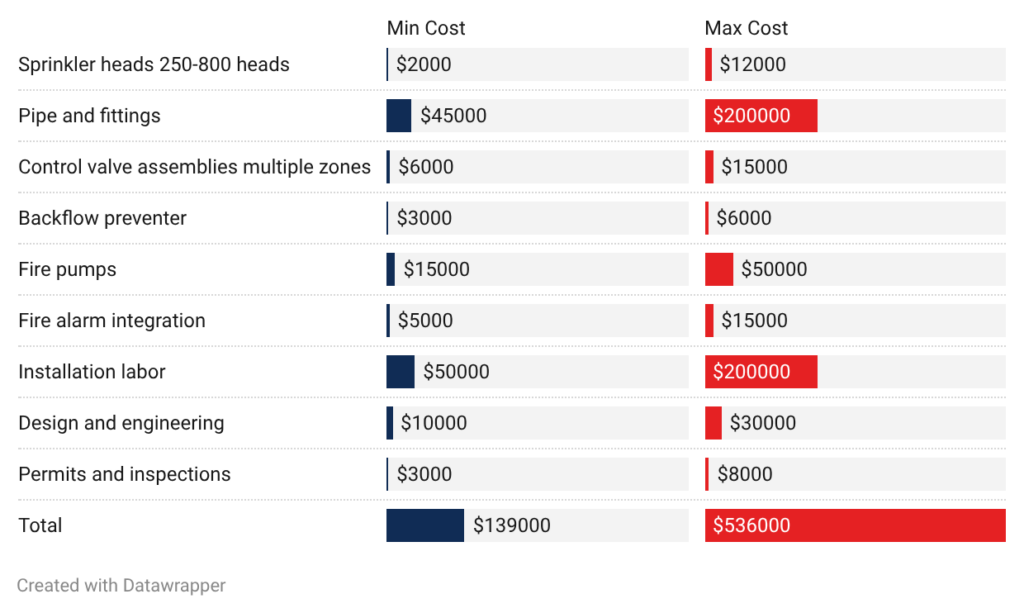 - 100,000 sq ft commercial: Very large projects run $300,000 to $700,000. High-rise buildings over 75 feet tall need standpipes, additional fire pumps, and sometimes rooftop water storage adding $100,000 to $200,000. Manufacturing facilities with special hazards push costs toward the high end.