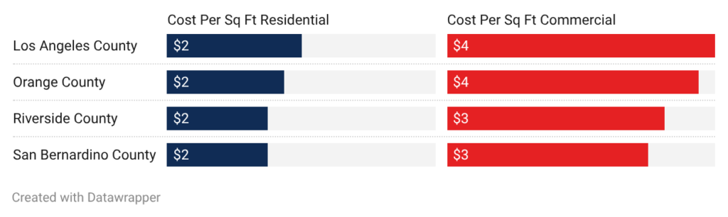 - San Bernardino County: San Bernardino County has the lowest costs at $1.50 to $3.00 per square foot residential and $2.75 to $6.00 commercial. A typical home needs $3,750 to $7,500. Labor runs $60 to $85 per hour. Permit fees are lowest in Southern California.