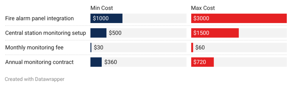 - Fire alarm integration: Connecting to fire alarms costs $1,000 to $3,000. This includes waterflow switches, tamper switches, and control modules.