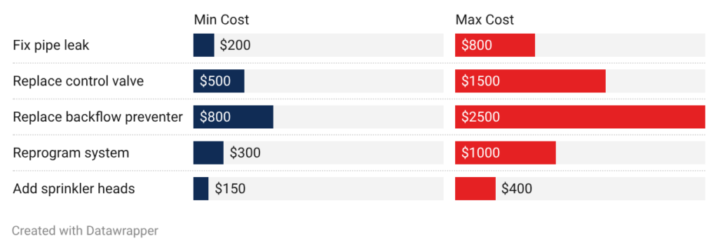 - Sprinkler head replacement: Replacing damaged heads costs $50 to $150 each. This includes the new head at $10 to $30, labor at $30 to $80, and system testing at $10 to $40.