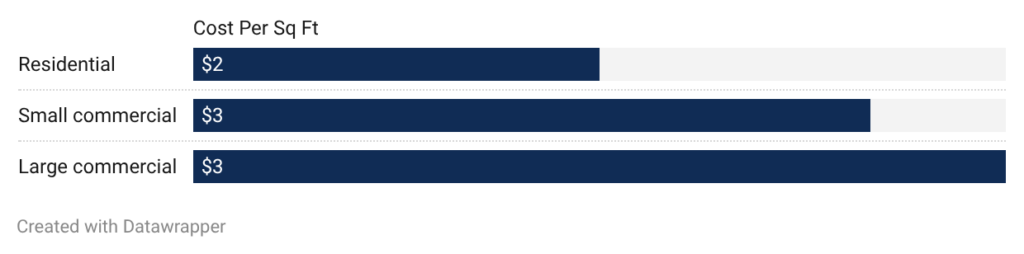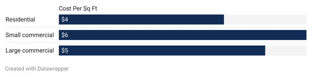 - Large commercial retrofit: Large retrofits cost $5.00 to $9.00 per square foot. Labor represents 60% at $3.00 to $5.40 per square foot. Some economies of scale reduce the per-square-foot cost compared to small retrofits.