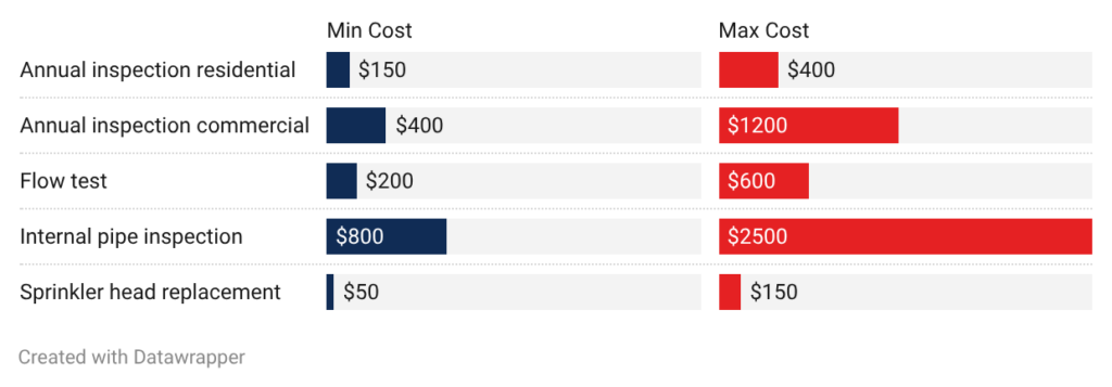 - Annual inspection (commercial): Commercial inspections run $400 to $1,200 per year. Small buildings cost $400 to $600. Large buildings with multiple zones need $800 to $1,200. Some occupancies need quarterly inspections instead.