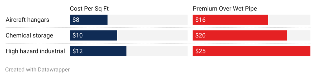 - Aircraft hangars: Deluge systems cost $8.00 to $16.00 per square foot. Foam concentrate systems add $3.00 to $5.00 per square foot. Specialized foam-water discharge devices cost more than standard sprinklers.