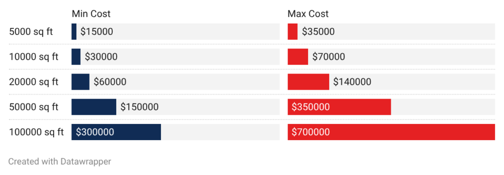 - 5,000 sq ft commercial: Small commercial spaces cost $15,000 to $35,000. Simple office layouts with 10-foot ceilings and standard construction run $15,000 to $22,000. Restaurants needing special kitchen suppression systems or retail stores with 20-foot ceilings cost $28,000 to $35,000.