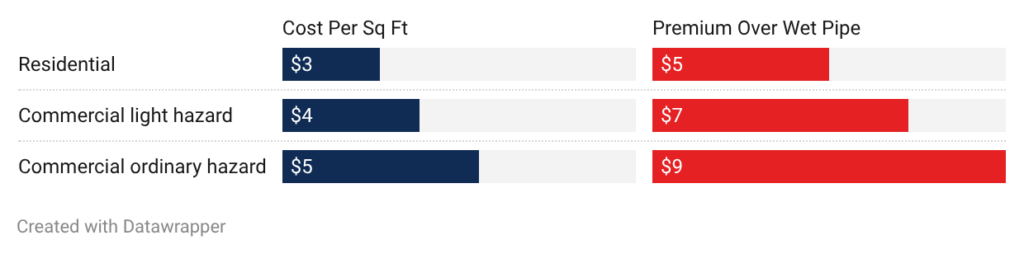 - Commercial light hazard: Light-hazard dry pipe runs $3.50 to $6.50 per square foot. The premium covers air compressor, dry pipe valve, and additional installation complexity.