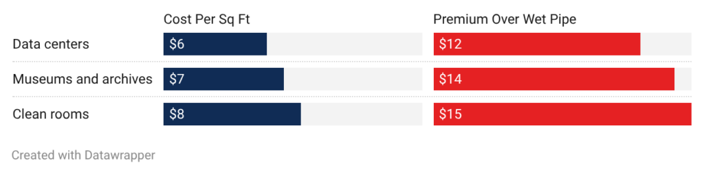 - Museums and archives: Protecting irreplaceable collections costs $7.00 to $14.00 per square foot. Extremely sensitive detection needed to prevent false discharges drives costs higher than standard applications.