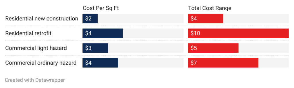 - Residential new construction: Wet pipe systems cost $1.50 to $3.50 per square foot. Simple layouts with standard ceilings run $1.50 to $2.00. Complex floor plans or high ceilings push costs to $3.00 to $3.50.