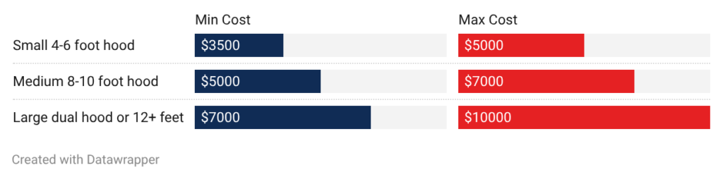 • Installation labor: Labor costs $1,200 to $6,000. Simple kitchen hood installations run $1,200 to $2,000. Complex industrial systems need $4,000 to $6,000 in labor. Working in occupied facilities or at heights increases labor costs.