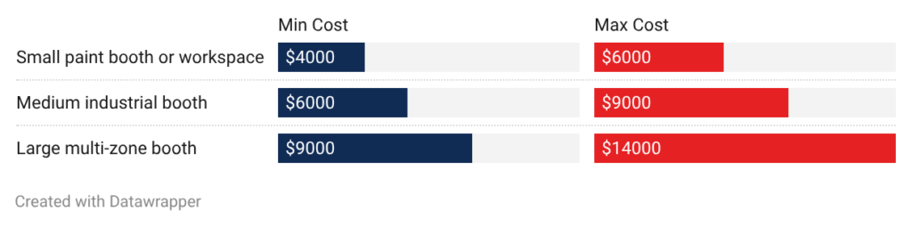 • Small booth systems: Compact paint booths cost $4,000 to $6,000. Systems use 20 to 50 pound dry chemical cylinders with 4 to 8 nozzles. Automotive body shops typically need systems in this range.