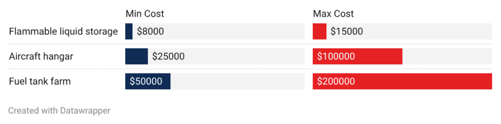 • Flammable liquid storage: Small storage areas cost $8,000 to $15,000. Foam concentrate mixes with water to create expansion ratios from 3:1 to 1000:1. Low-expansion foam works for liquid surface fires. Medium and high-expansion foam fills enclosed spaces.