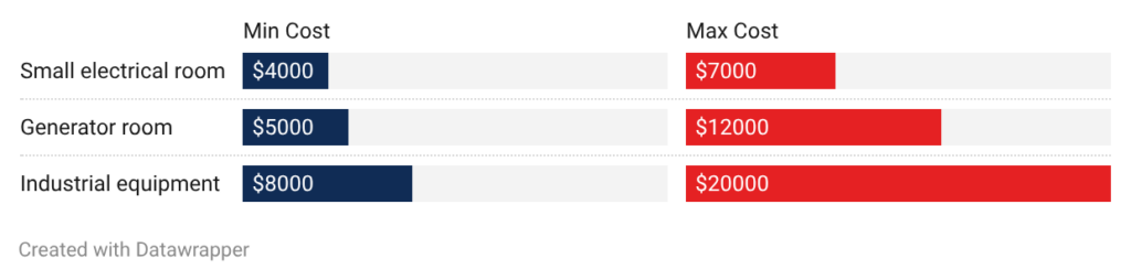 • Small electrical rooms: Compact electrical spaces cost $4,000 to $7,000 for CO2 protection. High-pressure CO2 cylinders discharge quickly to smother fires. The system works by displacing oxygen which presents safety concerns requiring proper ventilation and alarms.