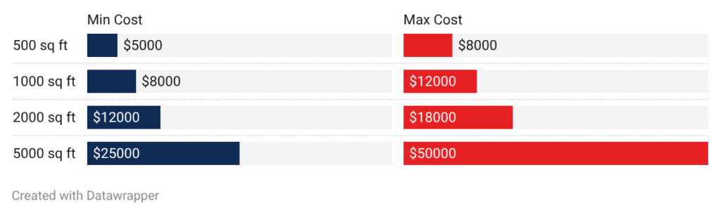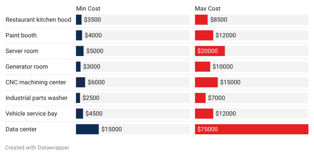 • Data center: Large data centers cost $15,000 to $75,000 depending on size. A 3,000 square foot facility runs $15,000 to $25,000. Enterprise data centers over 10,000 square feet need $50,000 to $75,000. Multiple zones with separate detection and suppression add to costs.