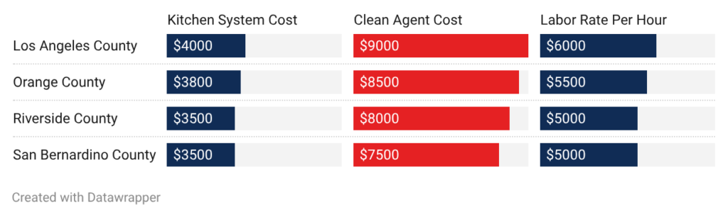 • Los Angeles County: Los Angeles County has the highest suppression system costs. Kitchen systems run $4,000 to $9,000. Clean agent systems cost $6,000 to $22,000. Labor rates run $85 to $120 per hour. Higher permit fees and stricter code enforcement drive costs up.