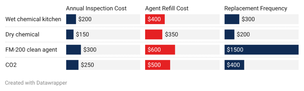 • FM-200 clean agent systems: Annual inspections cost $300 to $600. These systems need cylinder pressure checks and detection testing. The agent doesn’t degrade but cylinders need hydrostatic testing every 5 years at $200 to $400. Agent refills after discharge cost $1,500 to $5,000 depending on system size.
