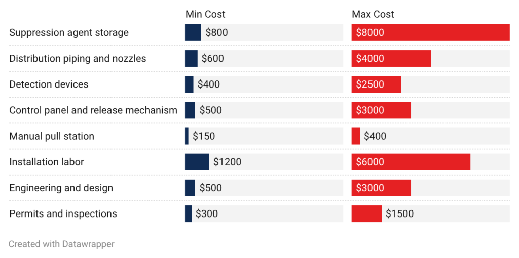 • Distribution piping and nozzles: Piping and nozzles run $600 to $4,000. Simple kitchen hood systems need $600 to $1,200. Complex paint booth systems with multiple discharge points cost $2,500 to $4,000. Stainless steel piping costs more than standard steel.